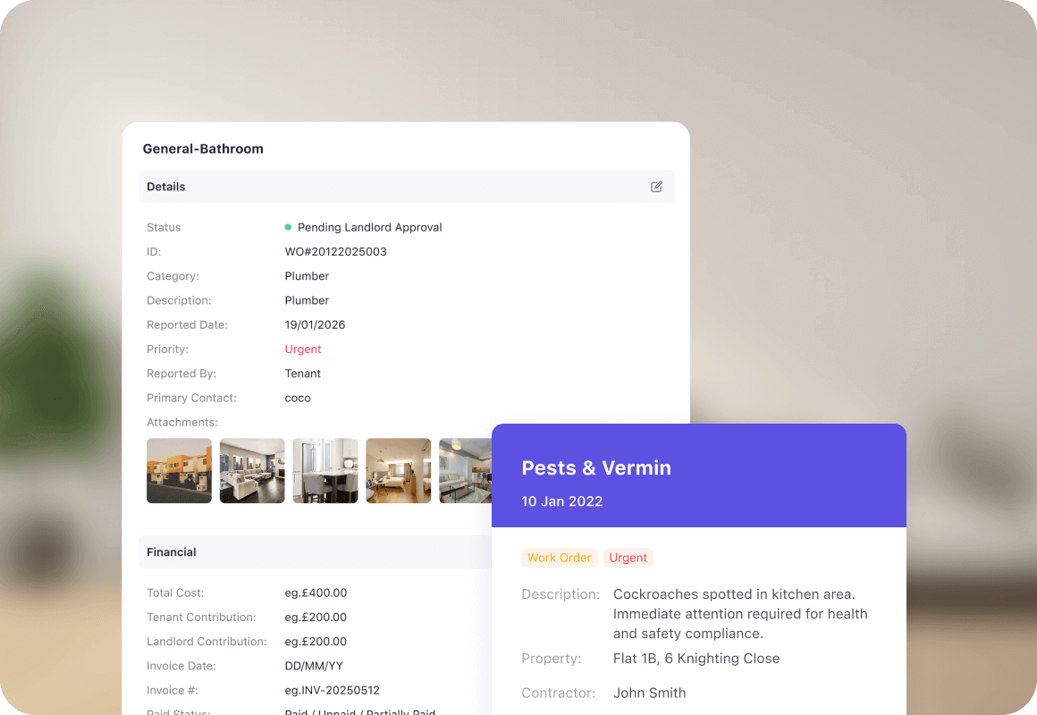 Manage repair requests without the chaos. Tenants can report problems online, suppliers can be assigned in seconds, and you stay on top of every ticket.